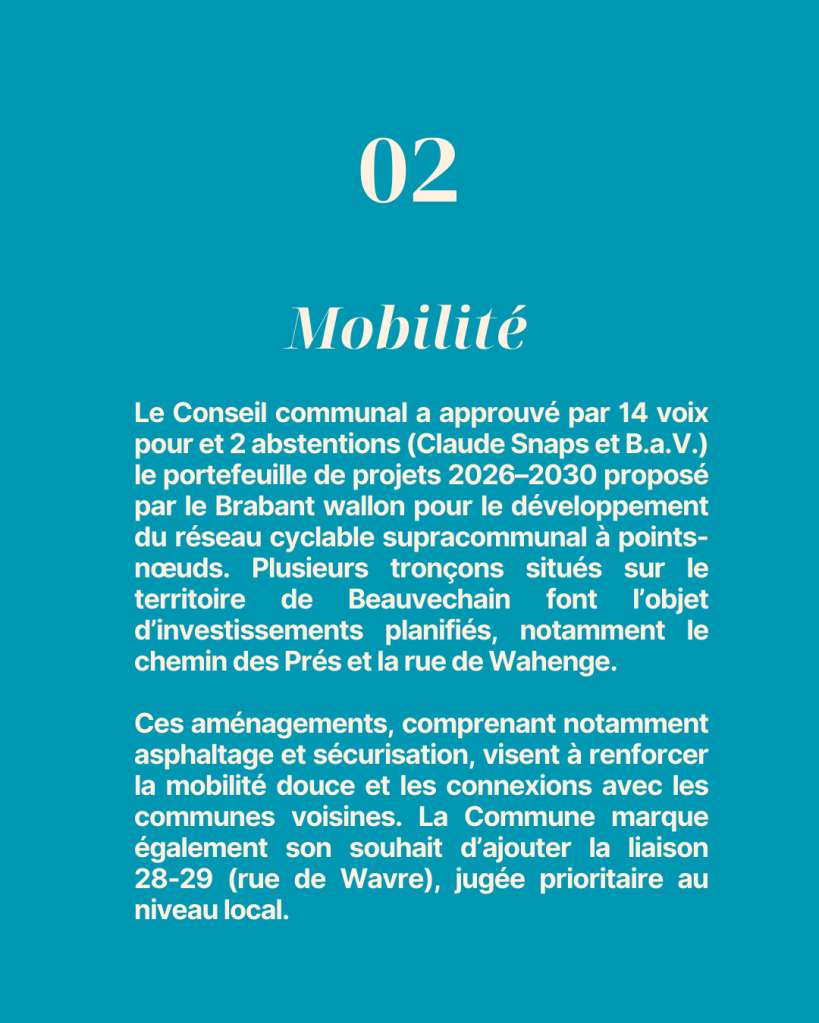 Le Conseil communal a approuvé par 14 voix pour et 2 abstentions (Claude Snaps et B.a.V.) le portefeuille de projets 2026–2030 proposé par le Brabant wallon pour le développement du réseau cyclable supracommunal à points-nœuds. Plusieurs tronçons situés sur le territoire de Beauvechain font l’objet d’investissements planifiés, notamment le chemin des Prés et la rue de Wahenge.